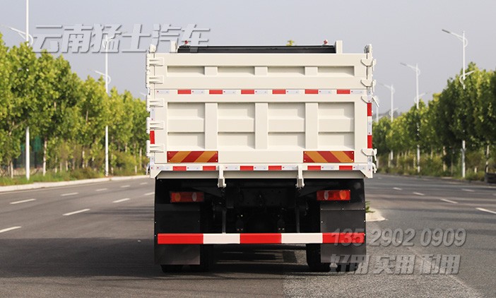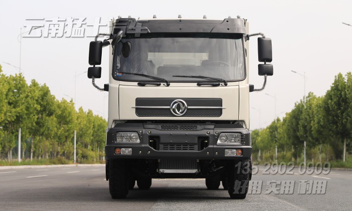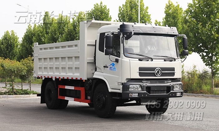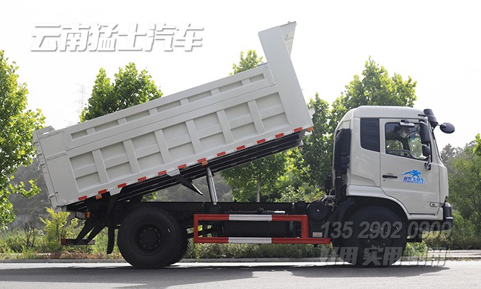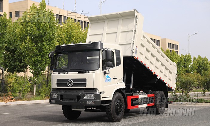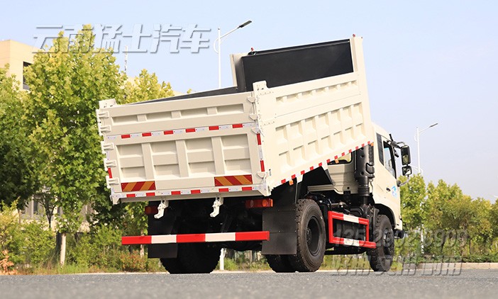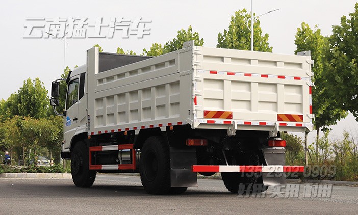 可承載9噸的東風自卸汽車,采用濰柴240馬力發(fā)動機,后輪驅動,后橋采用13噸輪邊減速橋,加裝了300L剎車降溫水箱,確保行駛安全。