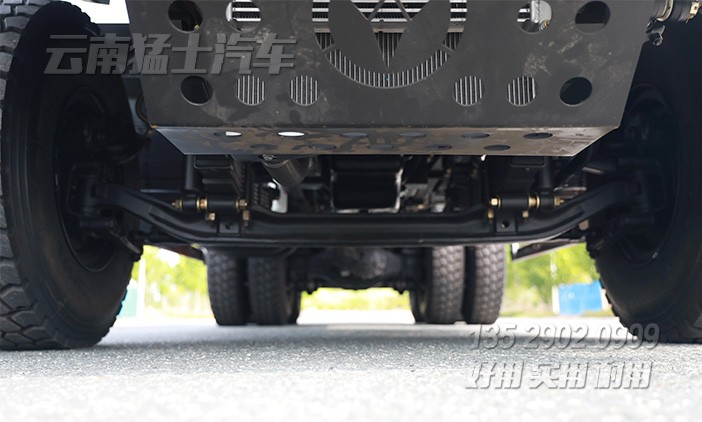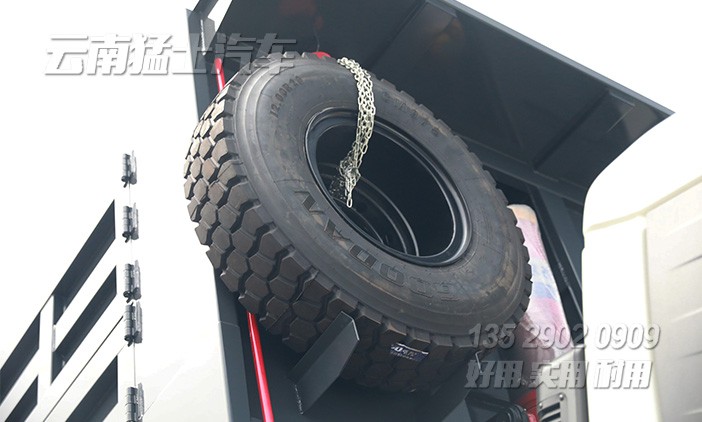 邊板田字格花紋,左右邊板可開(kāi)啟。備胎安裝在駕駛室與貨箱之間,有專用備胎升降機(jī)構(gòu)。