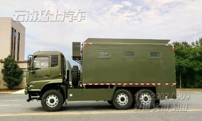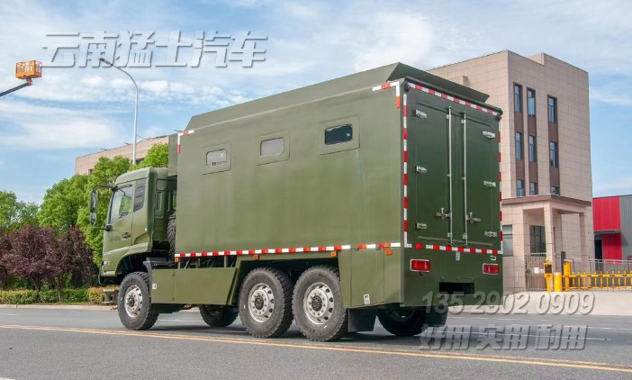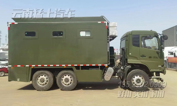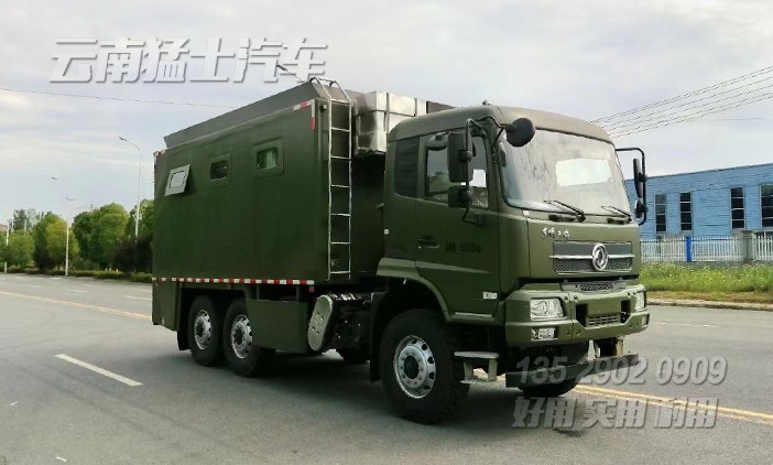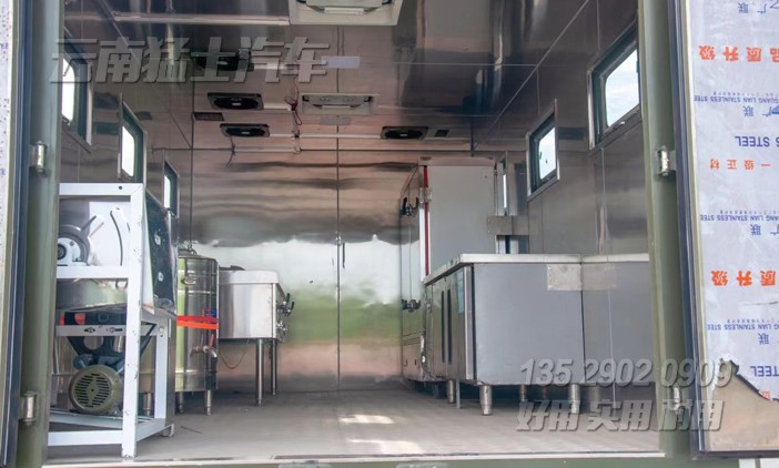 東風(fēng)自行式戶外炊事車,該車配備190馬力發(fā)動(dòng)機(jī),六輪驅(qū)動(dòng),可在惡劣路況下形式,主要針對戶外露營、野外訓(xùn)練中就餐使用,最多可容納200人就餐。