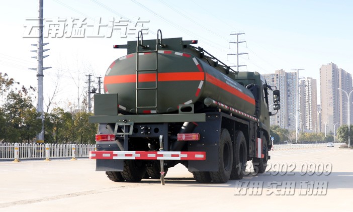 車尾帶有爬梯,可以通往罐體頂部。罐體頂部平臺兩側帶有折疊安全扶手,罐體頂部中間帶有歐標加油口,罐體內安裝2道阻浪板,隨車還配有油罐。