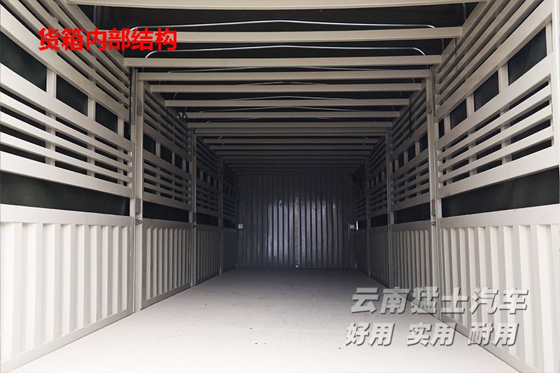 ? ? 該車(chē)總長(zhǎng)度約12米,其中貨箱長(zhǎng)9米,四周帶有示廓燈。前箱板側(cè)帶有爬梯,頂部帶有行李架,可存放雨布。左右箱板立柱不可拆卸,各分為上下兩部分,下半部分為4段800mm高瓦楞板,每段均可以向下翻轉(zhuǎn),上半部分為不可開(kāi)啟的倉(cāng)欄板。后箱板采用集裝箱門(mén)鎖結(jié)構(gòu),可對(duì)外270°開(kāi)啟。貨箱頂部帶有可調(diào)節(jié)高度的篷桿,篷桿可以最大升高700mm。貨箱底部帶有掛鉤,用于固定雨布。