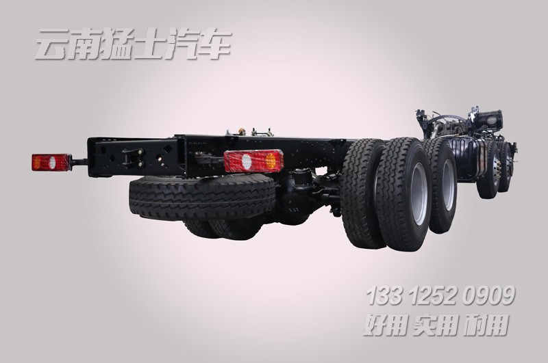 該底盤(pán)采用了玉柴420馬力發(fā)動(dòng)機(jī),軸距1850+4650+1350mm,前橋雙5噸,后橋雙10噸,最終將改裝成一輛平板運(yùn)輸車(chē)。