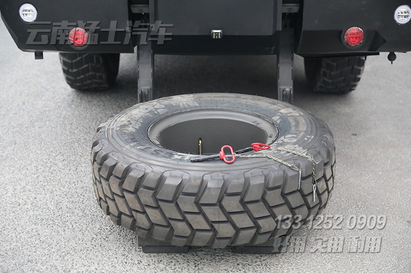 ? ? ? 作為一款可在惡劣路段下行駛的六驅(qū)越野客車,強大的越野性能靠的是多種強力配置的組合,其中輪胎也至關(guān)重要。該車采用12.5R20越野鋼絲輪胎,該輪胎比常規(guī)的輪胎相比要大,這樣可以一定程度上增大車輛的最小離地間隙和接近角離去角,同時內(nèi)部含有鋼絲,讓該輪胎的使用壽命和耐磨程度得到提升,不過相應(yīng)的也更重。在行駛過程中如輪胎發(fā)生故障需要更換,將變得不方便,所以我公司為該車設(shè)計了專用備胎架,方便備胎的裝卸。